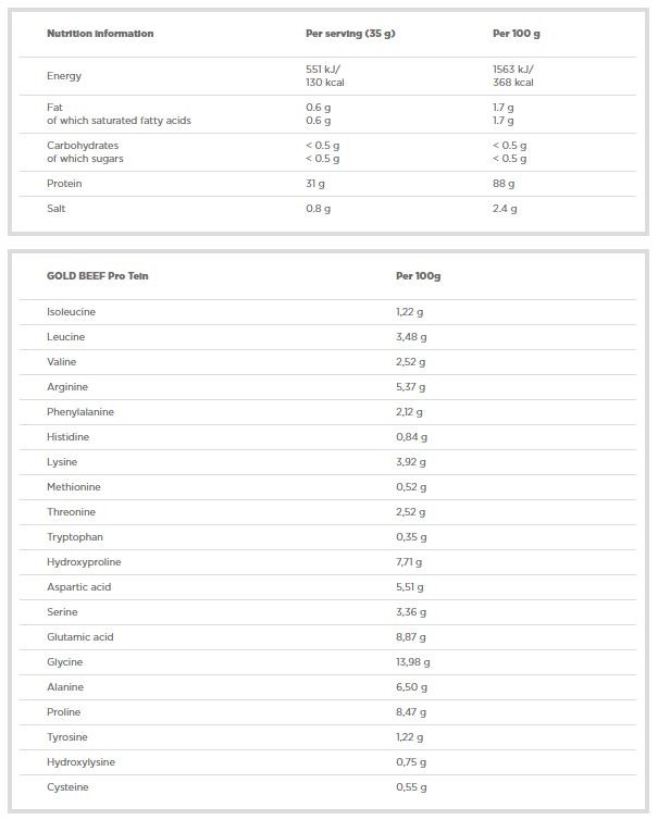 Осигуряването на правилен начин на хранене за хора, които имат физическа активност се се оказа не лесна задача на марки произвеждащи добавки. От основните причини е непрекъснато нарастващият брой спортисти. Тъй като все по-голям брой хора избират здравословна и съзнателна диета, има увеличена трудност, когато става въпрос за диагностициране на хранителни алергии или непоносимост, а те основно са свързани с млечни продукти, като фракции на суроватъчен протеин, но въпреки всичко са много ценни източници на протеини за тялото. GOLD BEEF-PRO - TEIN е отговор от специалистите на Olimp Labs за хранителни добавки за активни хора на въпроса за диверсификацията на източниците на протеини в хранителните планове на трениращи, които имат за задача да добавят висококачествено говеждо протеинови концентрати към техните диети. GOLD BEEF-PRO - TEIN минава очакванията на еднокомпонентните говежди протеинови хидролизати, които имат широка популярност на пазара в тои бранш. Този премиум продукт, с високо процентно съдържание на протеини и биоактивни пептиди от говежда кръвна плазма, показва широкоспектърно противовъзпалително действие, което може значително да допринесе за повишен растеж, качество, скорост на регенерация на мускулатурата, както и за по-добри променливи и обем на тренировка. Хидролизатът на говеждия протеин, които се използва за производството във фармацевтични условия, поради предишното си ензимно третиране, е източник на бързо асимилиращи се свободни аминокиселини и пептиди с ниско молекулно тегло, които се усвояват директно в кръвообращението за около 15 мин. след поглъщане. Той определено понижава риска от активиране на катаболни процеси в мускулните клетки, когато са подложени на стрес от упражнения или по време на временен недохранване. Доза:35 грама. Начин на прием: 35г - 1 мерителна лъжица веднъж на ден, най-добре след тренировка.