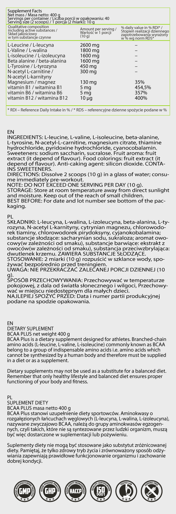BCAA с разклонена верига, обогатени с бета-аланин, хистидин и витамини от група B, осигуряват интензивен тласък на енергия и подпомагат възстановяването. Формула в съотношение 1,3:0,9:0,8, отразяваща естественото съдържание в мускулите, предпазва от мускулен разпад и подобрява клетъчната защита.