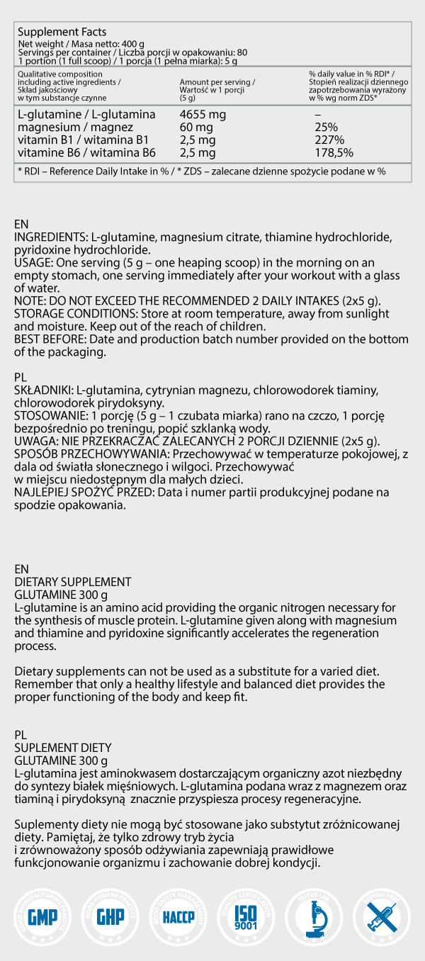Може да попитате: „Ами умората?“. не се безпокойте Освен глутамин, ние ви даваме всичко, от което тялото ви се нуждае, за да функционира с максимална мощност, без да се страхувате от претрениране – лесно усвоимият магнезий ще защити нервната ви система, докато тиаминът и пиридоксинът ще ускорят възстановяването. Ако смятате, че добавките с глутамин са махмурлук, все още не сте опитали GLUTAMINE IHS Technology!