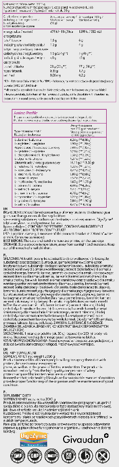 Нов състав 23g протеин на порция По-малко от един грам лактоза на 100g продукт! Подобрени вкусове и разтворимост Суровина с възможно най-високо качество Естествени аромати Без глутен Без ненужни пълнители