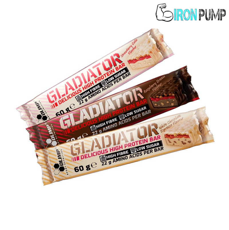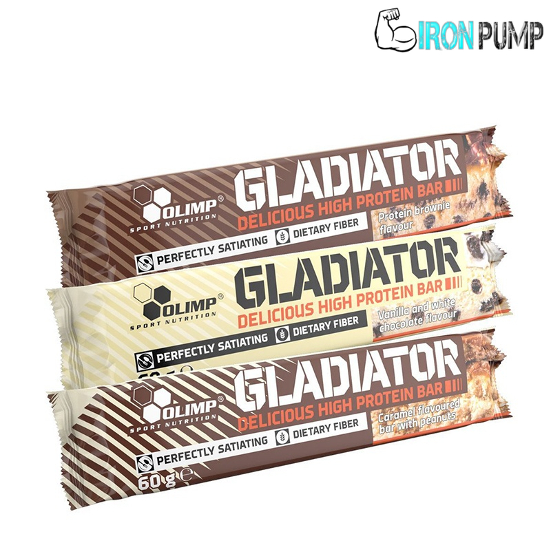 Gladiator Bar е протеинов бар с вкусен вкус и уникална текстура, идеален за закуска между храненията и получаване на допълнителна енергия по всяко време и на всяко място. Той е идеален да се яде преди или след тренировка като заместител на протеиновите шейкове, тъй като осигурява около 22 g протеин, перфектен да допринесе за поддържането и развитието на мускулната маса и допринася за възстановяването на мускулите. Закуска, за да се насладите без вина като допълнение към вашата диета, с 19 грама въглехидрати и по-малко от 2 грама са захари. Специално разработен за всички видове спортисти, които трябва да добавят повече протеин в диетата си и да се възстановяват по-бързо по време на своето определение и изграждане на мускулите. Освен това има високо съдържание на фибри, растителен компонент, който има основна роля в поддържането на микрофлората на дебелото черво, освен това добавя обем към диетата, което ви дава усещане за пълнота за по-дълго, което го прави идеален за ядене между хранене и се грижете за здравето си, без да се налага да напускате рутината си на здравословно хранене, перфектно, ако целта ви е да отслабнете и да отслабнете, без да чувствате глад. Всеки ден спортисти и любители на фитнеса се опитват да получат по-здравословни и полезни храни, които да добавят към диетата си без всички калории, захари и мазнини от конвенционални сладки и закуски и затова OLIMP SPORT проектира този висококачествен енергиен бар, с невероятен вкус и текстура и в перфектна порция от 60 г, която можете да вземете навсякъде, за да се отдадете на хранене, когато е необходимо, като ви помогне да постигнете физическата си цел много по-бързо и по чист и безопасен начин.