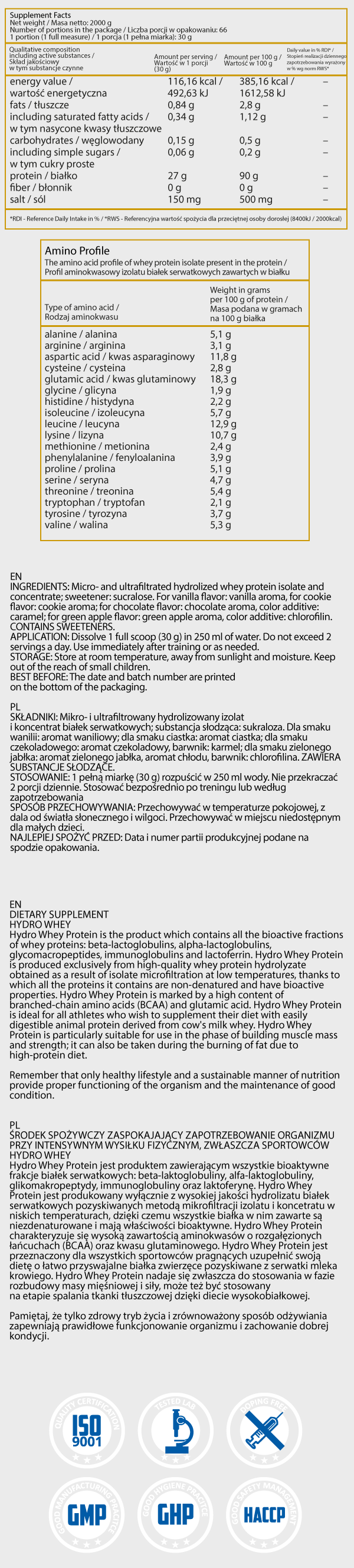 Това прави HYDRO WHEY идеален протеин за спортисти, които искат да ускорят възстановяването и да подобрят мускулния растеж веднага след тренировка. HYDRO WHEY е протеин с много висок процент протеиново съдържание на 100g от продукта. Следователно, той е едновременно ефективен и ефикасен, особено защото съдържа всички биоактивни фракции на суроватъчните протеини: бета-лактоглобулин, алфа-лакталбумин, гликомакропептиди, имуноглобулин и лактоферин. В допълнение, Hydro Whey Protein се характеризира с високо съдържание на аминокиселини с разклонена верига (BCAA).