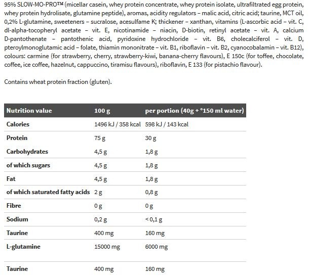 Уникалната формула SLOW-MO-PRO ™ включва всички източници на протеини, използвани досега в добавките, а техният състав, внимателно подбран от научния екип на OLIMP Laboratories, гарантира, че конкуренцията ще бъде безпомощна в лицето на Olimp Mega Strong Protein.