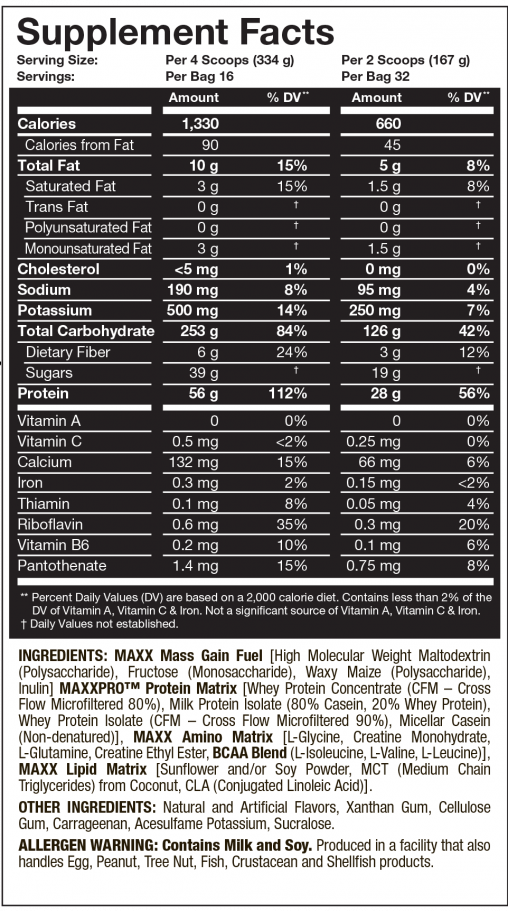 Четирите смеси на MuscleMaxx ™ MASS GAINER ви предоставят 4 различни протеини, всеки от които е проектиран да абсорбира с различна скорост, като ви осигурява бърза и бавна доставка на протеини. Въглехидратите са ключът към бързото увеличаване на мускулните печалби. MuscleMaxx ™ Mass Gainer осигурява огромни 253 г от 3 въглехидрати, за да подхранва вашите постижения и представяне във фитнес залата.