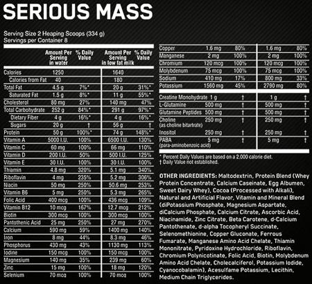 SERIOUS MASS е най-добрата формула за наддаване на тегло. Със 1250 калории на порция и 50 грама протеин за подкрепа за възстановяване на мускулите, този инстанцизиран прах прави идеалната след тренировка и между храненията за оразмеряване на вашите цели. SERIOUS MASS ви осигурява инструментите, които трябва да съберете килограмите и да ви помогне да развиете физиката, която винаги сте искали.