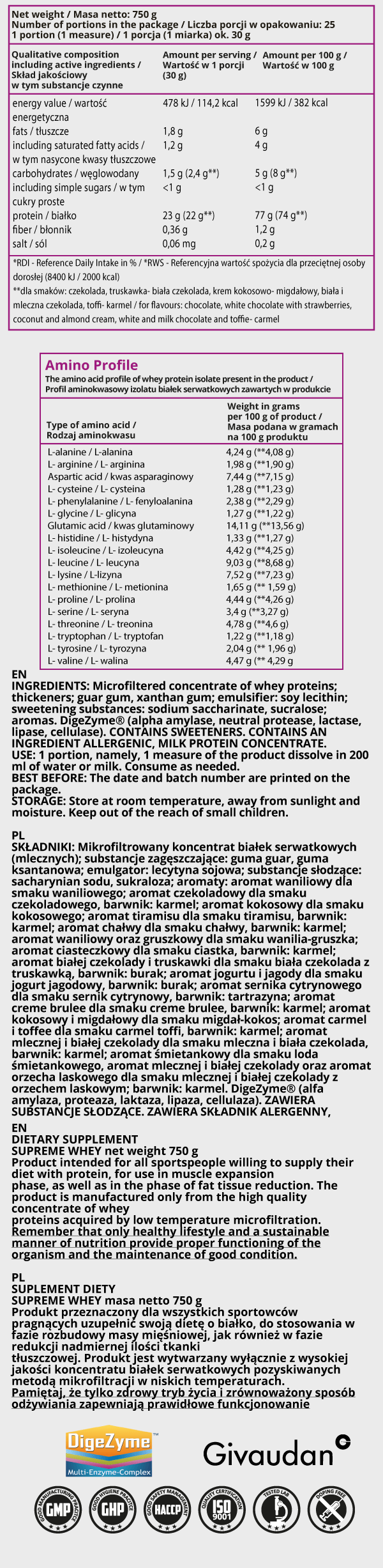 Supreme Whey е нов и подобрен протеин с 23g протеин на порция, по-малко от 1g лактоза на 100g продукт, и без глутен. С подобрени вкусове и разтворимост, той съдържа само висококачествени съставки и естествени аромати. С добавени ензими DigeZyme™ за подобрено храносмилане, дори след тежки тренировки.